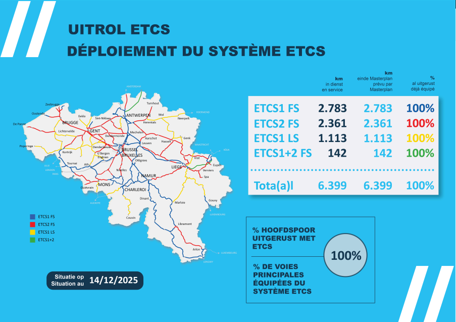 L’ETCS est un système de sécurité automatique qui réduit fortement le risque qu’un train dépasse un signal rouge. Une vitesse excessive, cause de nombreux accidents de train, devient aussi pratiquement impossible. Tant le train que l’infrastructure doivent être équipés en ETCS.