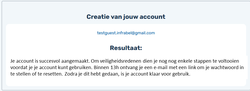 Voor de finale bevestiging van de creatie van je account, krijg je binnen de 13u een tweede e-mail. Kijk ook zeker eens in je Spam of bij ongewenste e-mails.
